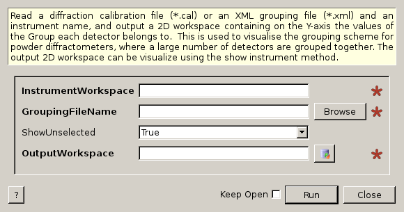 Read a diffraction calibration file (.cal) or an XML grouping file (.xml) and an instrument name, and output a 2D workspace containing on the Y-axis the values of the Group each detector belongs to. This is used to visualise the grouping scheme for powder diffractometers, where a large number of detectors are grouped together. The output 2D workspace can be visualize using the show instrument method.