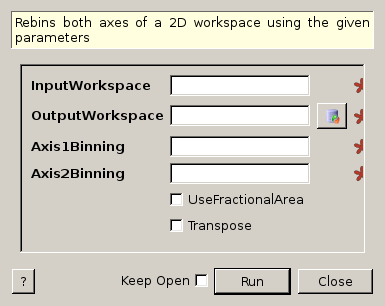 | Axis2Binning | Input | dbl list | Mandatory | A comma separated list of first bin boundary, width, last bin boundary. Optionally this can be followed by a comma and more widths and last boundary pairs. Negative width values indicate logarithmic binning. |