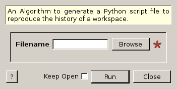| Filename | Input | string | Mandatory | The file into which the Python script will be generated. Allowed extensions: [‘.py’] |