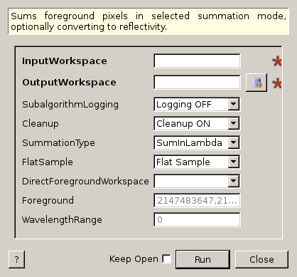 | OutputWorkspace | Output | MatrixWorkspace | Mandatory | The integrated foreground divided by the summed direct beam. |
