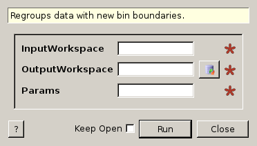 | Params | Input | dbl list | Mandatory | The new approximate bin boundaries in the form: x1,dx1,x2,dx2,...,xn |