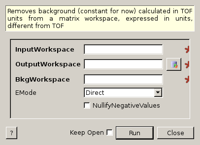 NOTE: If background is a single value workspace with zero signal and error, and property NullifyNegativeValues is set to True, the algorithm can be used to remove negative signal values and estimate errors during removal.