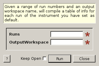 Given a range of run numbers and an output workspace name, will compile a table of info for each run of the instrument you have set as default.
