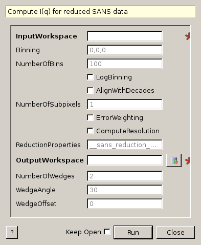 | OutputWorkspace | Output | MatrixWorkspace | Mandatory | I(q) workspace |