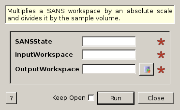 This algorithm scales a SANS workspace according to the settings in the state object. The scaling includes division by the volume of the sample and multiplication by an absolute scale. Currently the mask mechanism is implemented for SANS2D, LOQ and LARMOR.