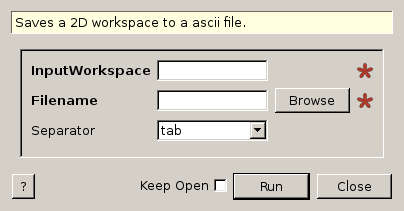 | InputWorkspace | Input | MatrixWorkspace | Mandatory | The name of the workspace containing the data you want to save. |
