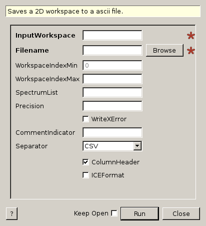 | InputWorkspace | Input | MatrixWorkspace | Mandatory | The name of the workspace containing the data you want to save to a Ascii file. |