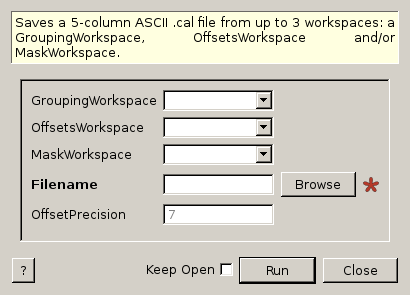 Saves a 5-column ASCII .cal file from up to 3 workspaces: a GroupingWorkspace, OffsetsWorkspace and/or MaskWorkspace.