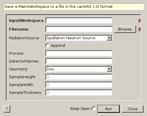 | Append | Input | boolean | False | Selecting append allows the workspace to be added to an existing canSAS 1-D file as a new SASentry |