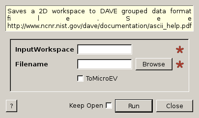 Saves a 2D workspace to DAVE grouped data format file.See http://www.ncnr.nist.gov/dave/documentation/ascii_help.pdf
