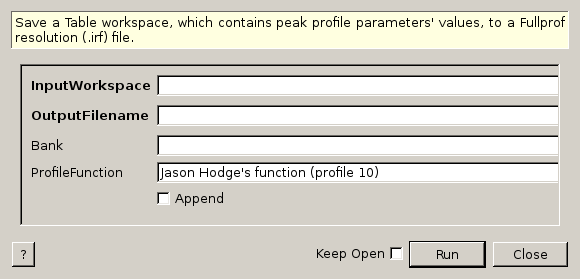 Save a Table workspace, which contains peak profile parameters’ values, to a Fullprof resolution (.irf) file.