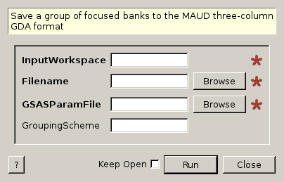 Takes a WorkspaceGroup whose children are single-spectra workspaces corresponding to focused banks, and saves them to the MAUD-readable .gda format.