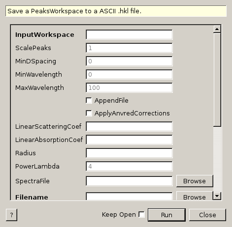 | OutputWorkspace | Output | PeaksWorkspace | SaveHKLOutput | Output PeaksWorkspace |