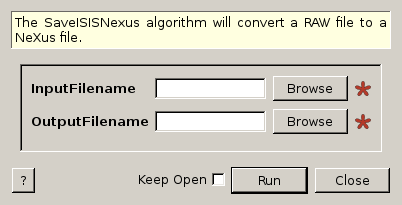 The algorithm SaveISISNexus will write a Nexus data file from the given RAW file. The output file name can be an absolute or relative path and should have the extension .nxs, .nx5 or .xml. Warning - using XML format can be extremely slow for large data sets and generate very large files. Both the extensions nxs and nx5 will generate HDF5 files.