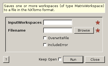 | Filename | Input | string | Mandatory | The name of the NXTomo file to write, as a full or relative path. Allowed extensions: [‘.nxs’] |