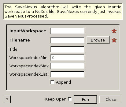 | Filename | Input | string | Mandatory | The name of the Nexus file to write, as a full or relative path. Allowed extensions: [‘.nxs’, ‘.nx5’, ‘.xml’] |
