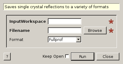 | Format | Input | string | Fullprof | The output format to export reflections to. Allowed values: [‘Fullprof’, ‘GSAS’, ‘Jana’, ‘SHELX’] |