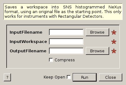 | InputWorkspace | Input | MatrixWorkspace | Mandatory | Name of the workspace to be saved |