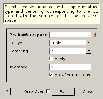 Given a PeaksWorkspace with a UB matrix corresponding to a Niggli reduced cell, this algorithm will allow the user to select a conventional cell with a specified cell type and centering. If the apply flag is not set, the information about the selected cell will just be displayed. If the apply flag is set, the UB matrix associated with the sample in the PeaksWorkspace will be updated to a UB matrix corresponding to the selected cell AND the peaks will be re-indexed using the new UB matrix. NOTE: The possible conventional cells, together with the corresponding errors in the cell scalars can be seen by running the ShowPossibleCells algorithm, provided the stored UB matrix corresponds to a Niggli reduced cell.