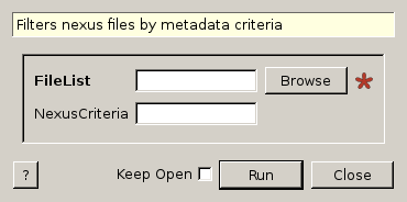 | NexusCriteria | Input | string | Logical expresion for metadata criteria using python syntax. Provide full absolute names for nexus entries enclosed with $ symbol from both sides. | |