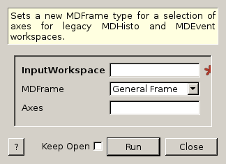 This algorithm allows the user to set the MDFrame type for each axis on a workspace. The algorithm makes it possible to introduce the correct MDFrame type to workspaces which are associated with legacy files. Note that this can only be applied to MDHisto and MDEvent workspaces.