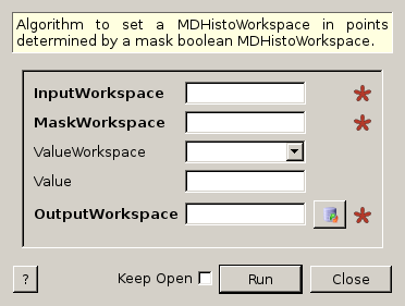 A mask MDHistoWorkspace is provided, where non-zero values indicate ‘true’. At these points, the corresponding value in the ValueWorkspace will be set. Any ‘false’ points in the MaskWorkspace are skipped.
