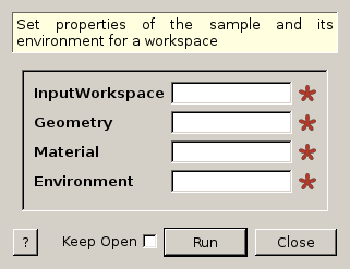 | Material | Input | Dictionary | A dictionary of material parameters for the sample. See SetSampleMaterial for all accepted parameters | |