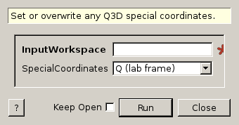 | SpecialCoordinates | Input | string | Q (lab frame) | What will be the dimensions of the output workspace? Q (lab frame): Wave-vector change of the lattice in the lab frame. Q (sample frame): Wave-vector change of the lattice in the frame of the sample (taking out goniometer rotation). HKL: Use the sample’s UB matrix to convert to crystal’s HKL indices. Allowed values: [‘Q (lab frame)’, ‘Q (sample frame)’, ‘HKL’] |