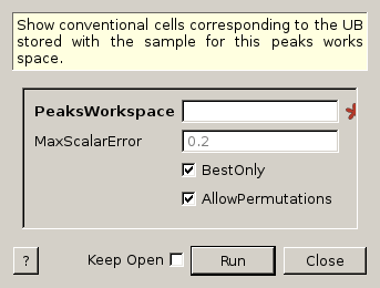 Given a PeaksWorkspace with a UB matrix corresponding to a Niggli reduced cell, this algorithm will display a list of possible conventional cells. The max scalar error property sets a limit on the maximum allowed error in the cell scalars, to restrict the list to possible cells that are a good match for the current reduced cell. The list can also be forced to contain only the best fitting conventional cell for each Bravais lattice type, by setting the best only property to true.