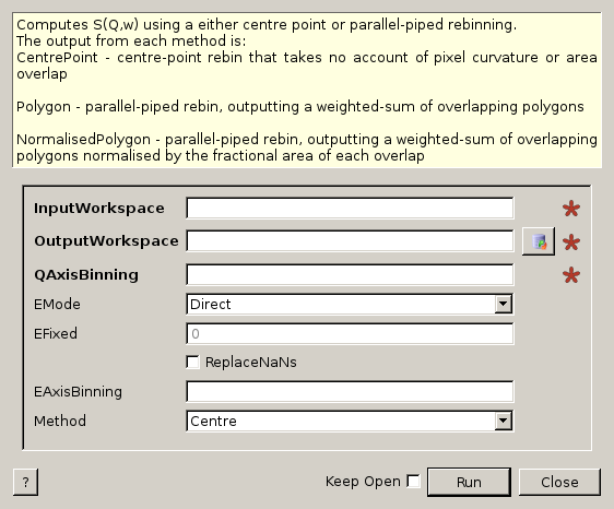 | OutputWorkspace | Output | MatrixWorkspace | Mandatory | The name to use for the q-omega workspace. |