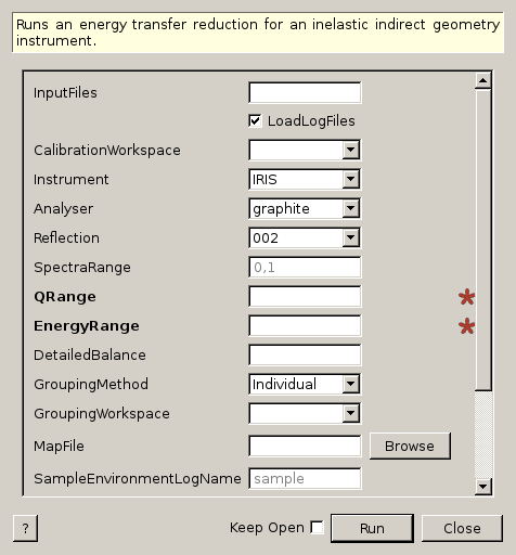 | Instrument | Input | string | Mandatory | Instrument used during run. Allowed values: [‘IRIS’, ‘OSIRIS’] |