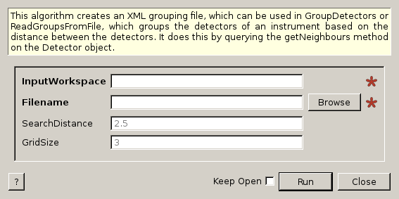 This algorithm creates an XML grouping file, which can be used in GroupDetectors or ReadGroupsFromFile, which groups the detectors of an instrument based on the distance between the detectors. It does this by querying the getNeighbours method on the Detector object.