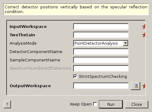 corrected_ws = SpecularReflectionPositionCorrect(InputWorkspace=ws, DetectorComponentName='point-detector', AnalysisMode='PointDetectorAnalysis', TwoThetaIn=45.0, Version=1)