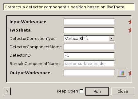 | DetectorCorrectionType | Input | string | VerticalShift | Whether detectors should be shifted vertically or rotated around the sample position. Allowed values: [‘RotateAroundSample’, ‘VerticalShift’] |