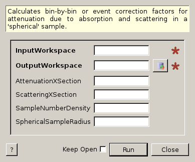 Calculates bin-by-bin or event correction factors for attenuation due to absorption and scattering in a spherical sample. Sample data should be divided by these corrections. Algorithm calls AnvredCorrection v1.