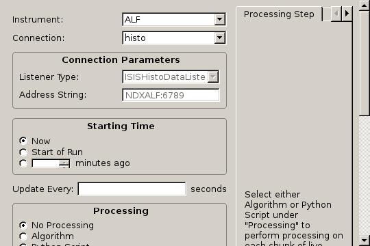 StartLiveData(Instrument='ISIS_Histogram', OutputWorkspace='wsOut', UpdateEvery=1,