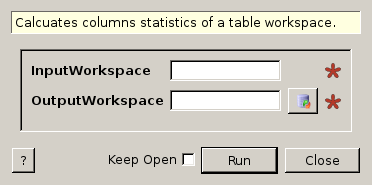 | OutputWorkspace | Output | TableWorkspace | Mandatory | Output workspace contatining column statitics. |