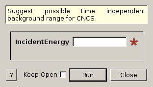 Suggest possible time independent background range for CNCS. It works for incident energy range from 0.5 to 50 meV. By default TibMax is 500 microseconds before the neutrons arrive at the sample, and TibMin is 3400 microseconds before Tibmax. This range is moved around if a prompt pulse is in this interval, or it goes below the TOF frame minimum, or it can be reduced to 2400 microseconds.