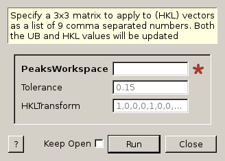 | HKLTransform | Input | dbl list | 1,0,0,0,1,0,0,0,1 | Specify 3x3 HKL transform matrix as a comma separated list of 9 numbers |
