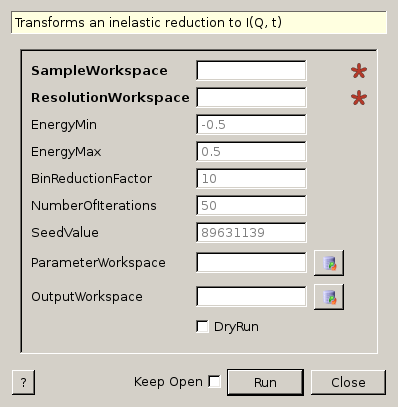 | ResolutionWorkspace | Input | MatrixWorkspace | Mandatory | Name for the resolution workspace. |