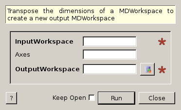 Performs an axis-aligned traspose of a MDHistoWorkspace. Default Axes setting gives not transpose. It is possible to remove dimensions from the input workspace by omitting those dimension indexes from the Axes property. Axes are zero-based indexes.