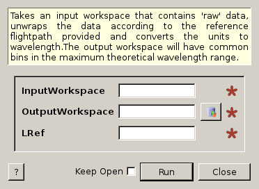 Takes an input workspace that contains ‘raw’ data, unwraps the data according to the reference flightpath provided and converts the units to wavelength.The output workspace will have common bins in the maximum theoretical wavelength range.
