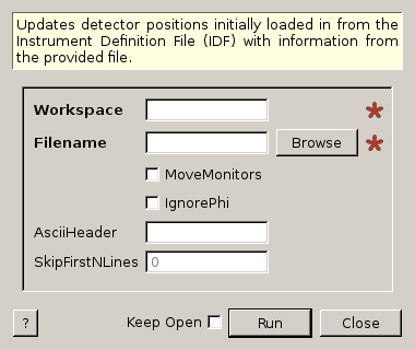 The ASCII format allows a multi-column text file to provide new positions along with additional parameters for each detector. If a text file is used then the AsciiHeader parameter is required as it identifies each column in the file as header information in the file is always ignored. There is a minor restriction in that the first column is expected to specify either a detector ID or a spectrum number and will never be interpreted as anything else.