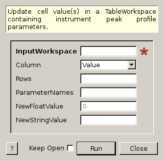 UpdatePeakParameterTableValue(tablews, Column="Value", ParameterNames=["A"], NewFloatValue=1.00)