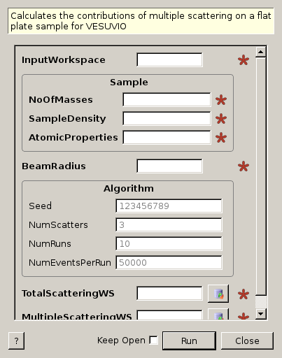 | MultipleScatteringWS | Output | MatrixWorkspace | Mandatory | Workspace to store the calculated multiple scattering counts summed for all orders |