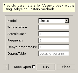 This algorithm uses either the Debye or Einstein method to calculate kinetic energy and root mean squared momentum and in the Debye case, root mean squared displacement, from a given temperature and atomic mass. The outputs from this can be used to help predict the nature of peaks in Vesuvio data.
