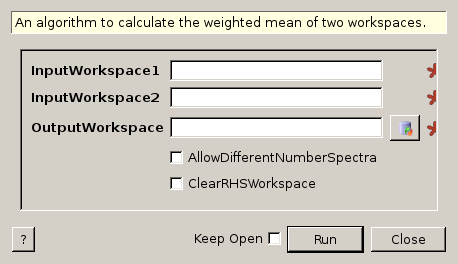 | InputWorkspace1 | Input | MatrixWorkspace | Mandatory | The name of the input workspace on the left hand side of the operation |