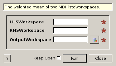 Takes two MDHistoWorkspaces and calculates the weighted mean for each bin. See WeightedMean v1 for more details on the algorithm workings. Both inputs must be MDHistoWorkspaces, the algorithm will not run with MDEventWorkspaces.