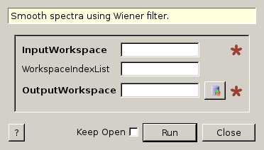 | WorkspaceIndexList | Input | int list | Workspace indices for spectra to process. If empty smooth all spectra. | |