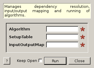 This utility algorithm is used to control consecutive executions of another algorithm. After defining a table of desired input and output properties, WorkflowAlgorithmRunner connects the outputs to input properties, declares the order of execution, and runs the algorithm. It is mainly meant for managing the execution of workflow algorithms for data reduction purposes although it can run all types of algorithms.